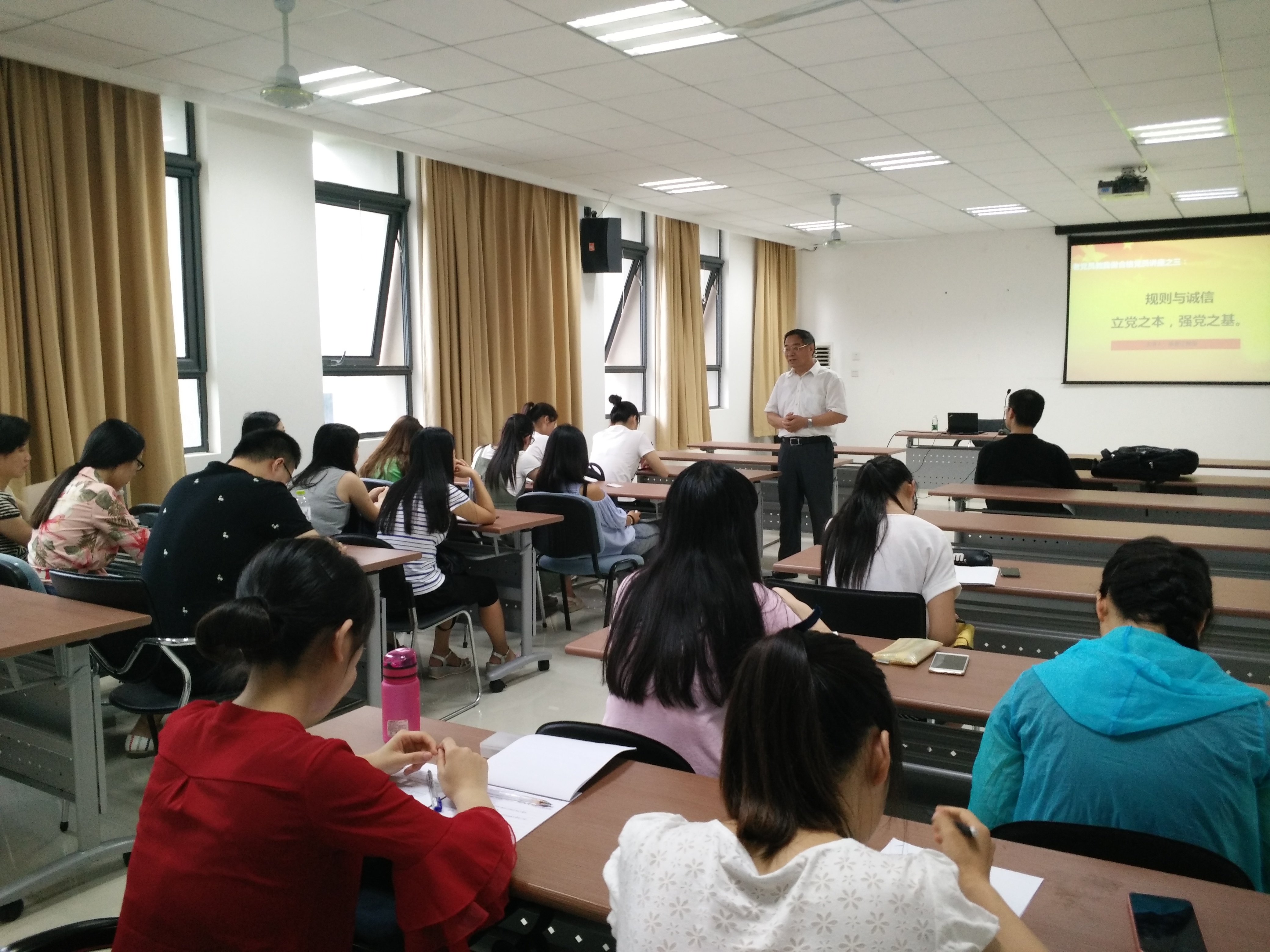 6月15日下午,“两学一做”学习教育之“老党员教我做合格党员”主题党课第三讲在模拟法庭举办,法学专业陈爱江教授为十三水在线 全体学生党员开讲。陈老师结合法学专业特色,从规则和诚信角度阐述党员的基本要求、自身素养和自我约束。