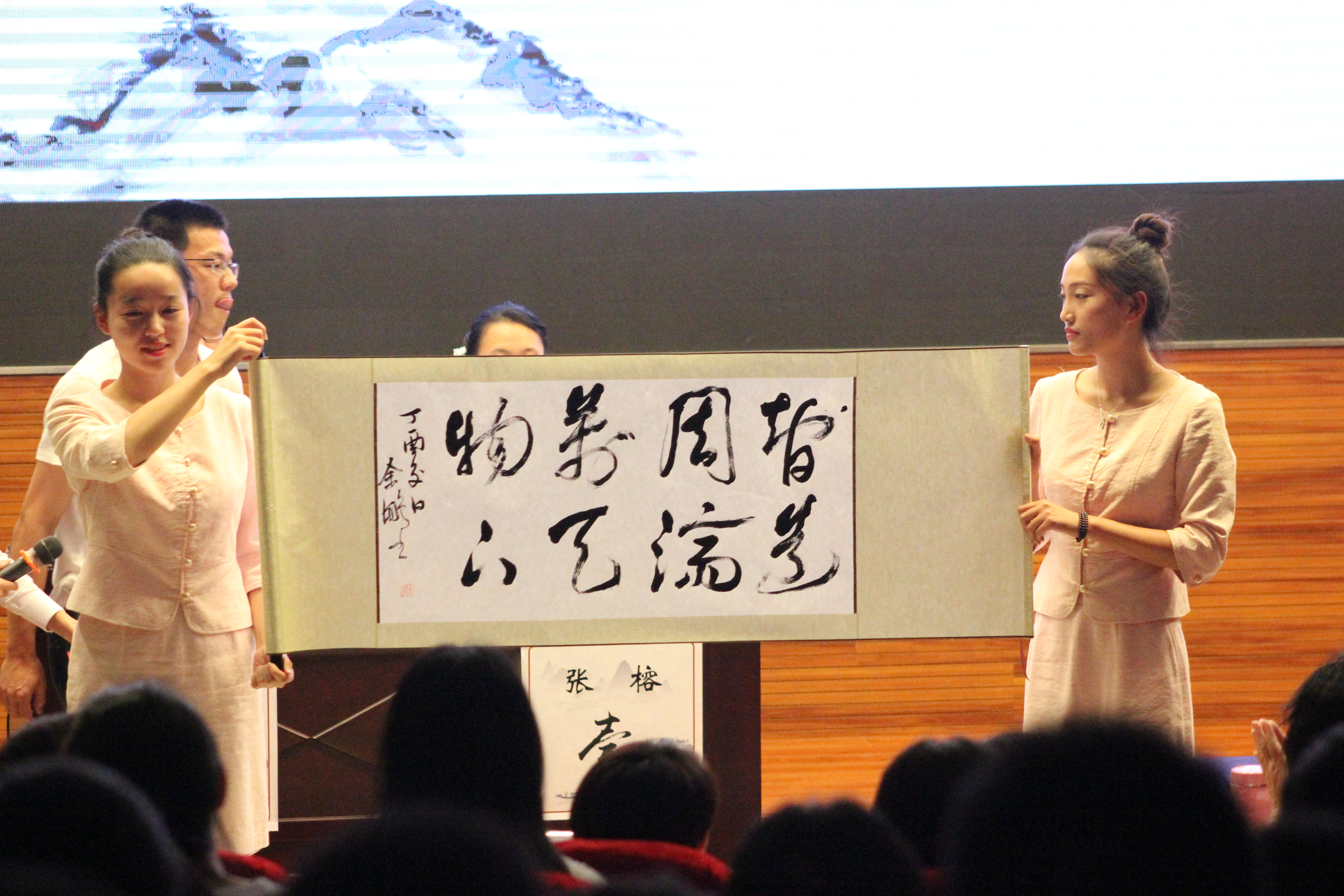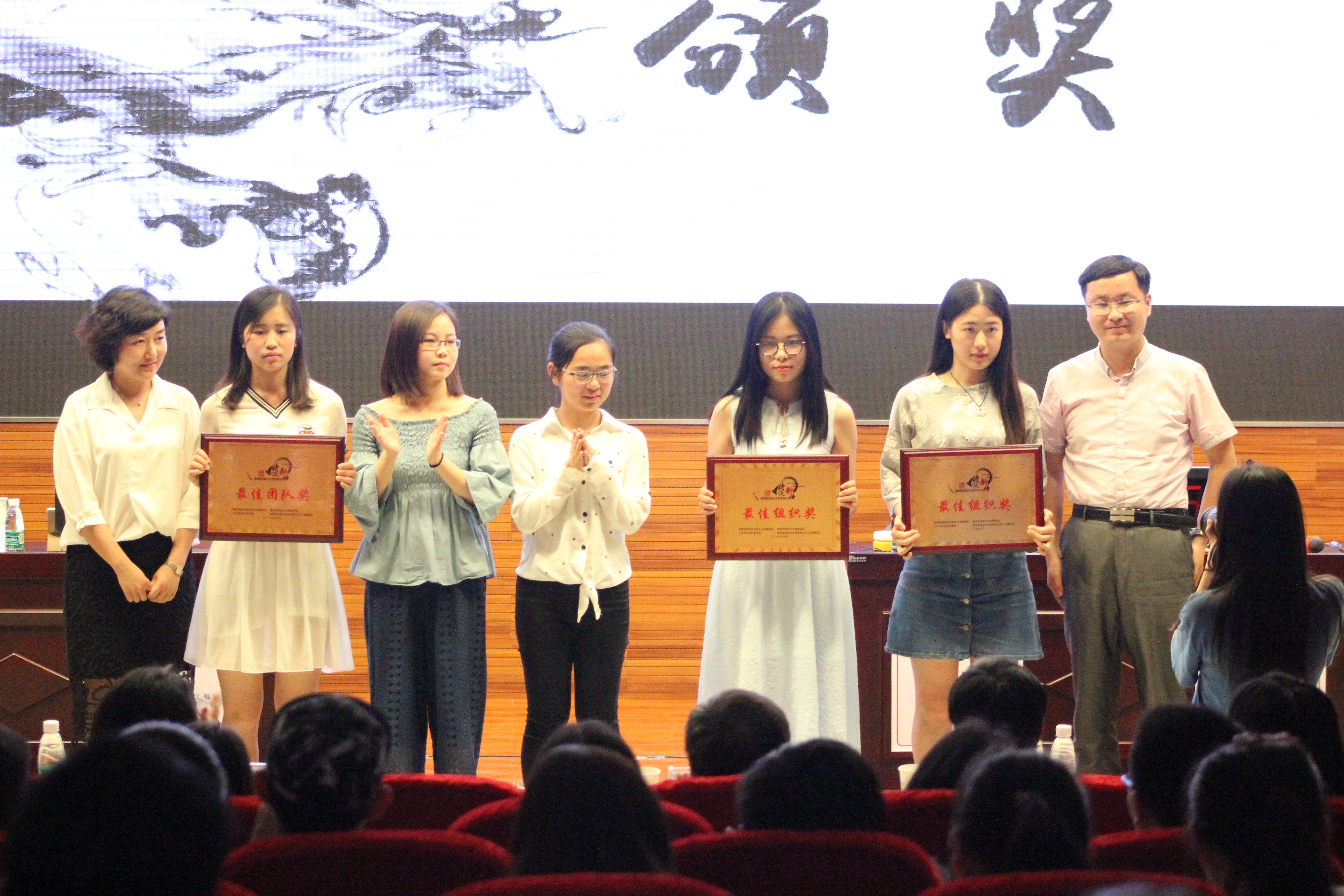 的余鹏同学现场泼墨,带领大家重温校训“智周万物,道济天下”的深刻含义。此后比赛更为焦灼,校电视台播音员主持人、国家级普通话测试员周敏燕老师,用优美的声音亲自为选手们播报题目,并带领全场共同朗诵了一首《望江南·超然台作》,现场观众不仅受到传统文化熏陶,更享受了一场视听盛宴。最终经过激烈的加赛角逐,来自经济管理十三水在线