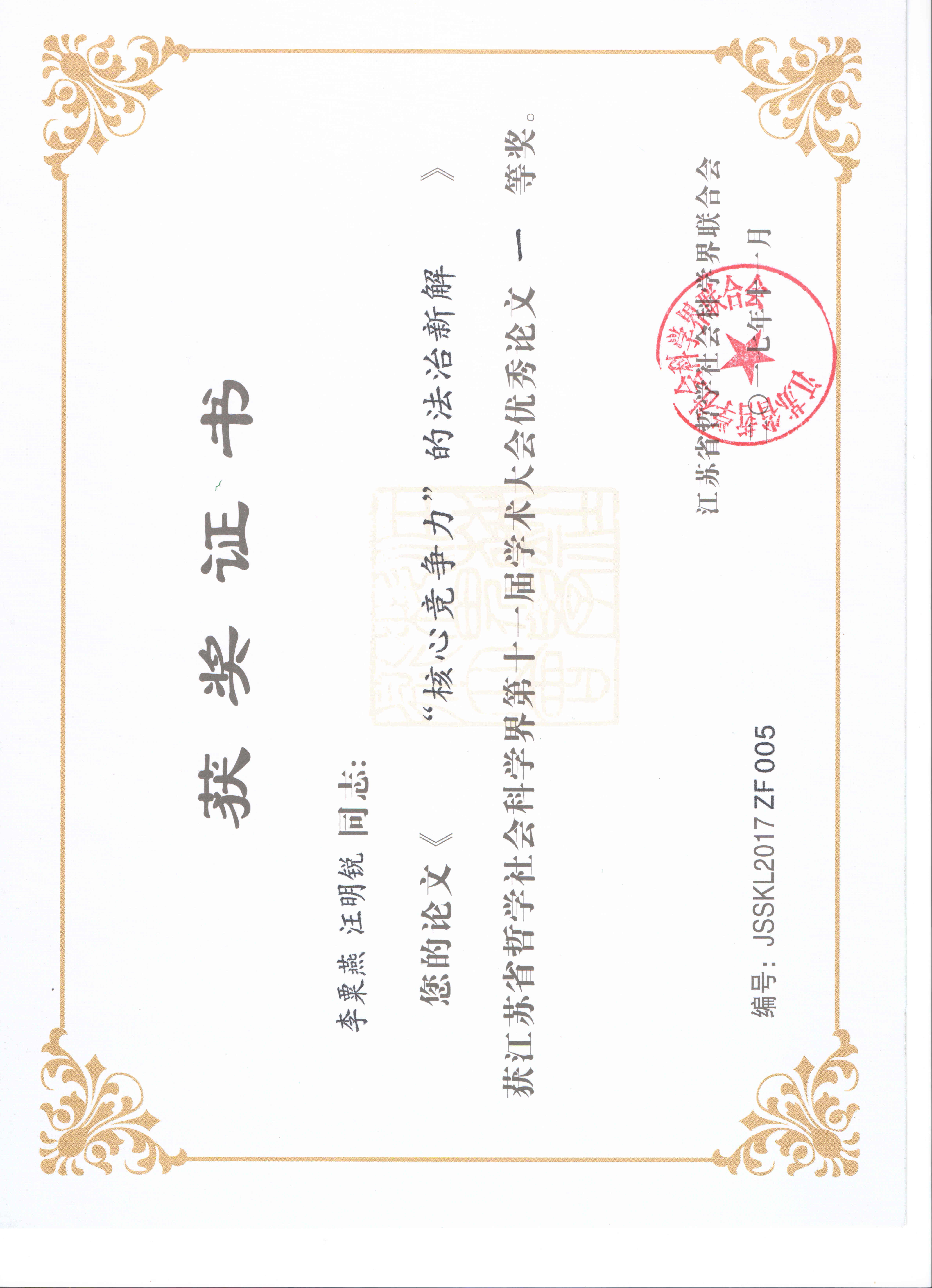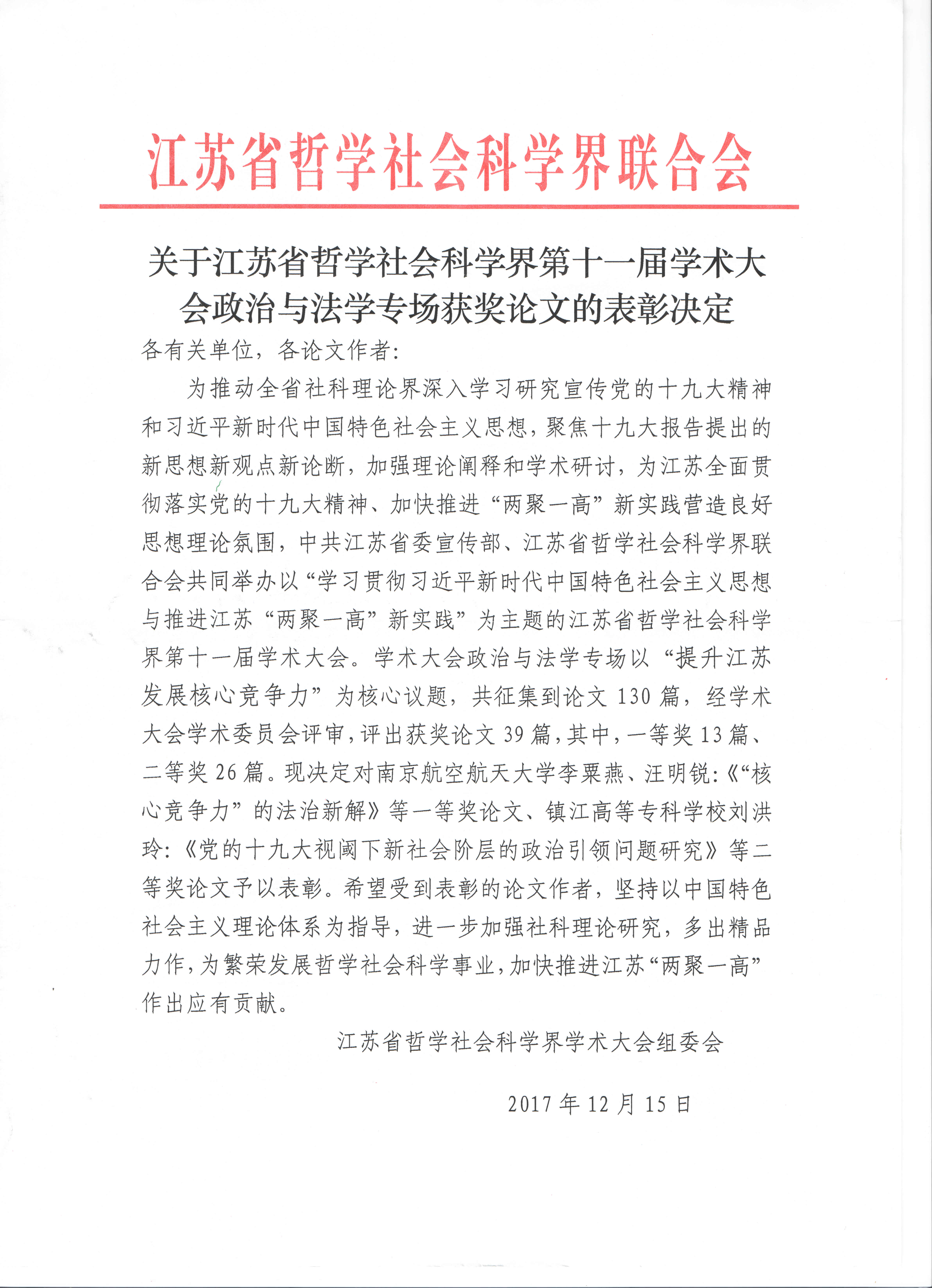 江苏省哲学社会科学界第十一届学术大会政治与法学专场的主题是“提升江苏发展核心竞争力”,来自省内外高校、党校、科研机构和法律实务界的代表100多人参加了政治与法学专场的会议,围绕这一主题展开热烈研讨。本次会议共征集论文130余篇,经学术委员会评审,评出获奖论文39篇,十三水在线 李栗燕教授与其研究生汪明锐同学合作的论文《“核心竞争力”的法治新解》荣获江苏省哲学社会科学界第十一届学术大会优秀论文一等奖,李栗燕教授应邀参加会议并在法学专场作了大会发言。