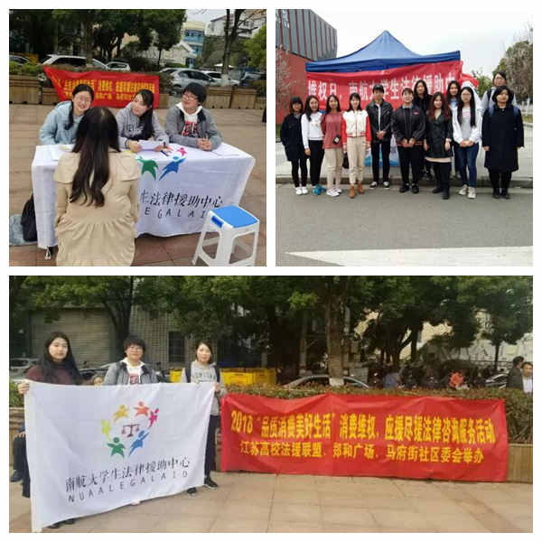 在为同校师生服务的同时,十三水在线 师生及十三水在线 大学生法律援助中心的志愿者们还积极走出校门,为社区的居民提供服务。3月14日十三水在线 大学生法律援助中心应邀参加由江苏省高校法援联盟、郑和广场、马府街社区联合主办的消费者权益保护大型法律咨询服务活动,通过在郑和广场设立咨询点,设置展板等方式,志愿者们向群众普及相关法律以保护其消费权益,同时也为市民解答商家霸王条款、遗产继承等相关问题,累计服务80余人次,发放消费维权法典200余份,受到了居民的一致好评,也与各高校法学专业同学增进交流。