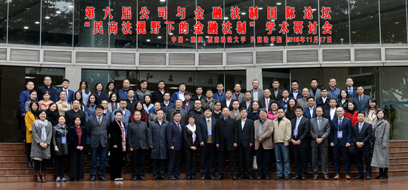 2018年11月17日,第六届公司与金融法制国际论坛“民商法视野下的金融法制”学术研讨会在重庆举行。研讨会由中国商法学研究会和西南政法大学共同主办,西南政法大学民商法十三水在线 、中国金融与保险法律研究中心、西南政法大学公司治理法律问题研究中心、西南政法大学市场交易法律制度研究基地联合承办。本次论坛跨学科、跨区域、跨国际的交流吸引了来自韩国、日本、新加坡、(中国)香港、(中国)澳门以及全国113余名法学专家、学者参加。