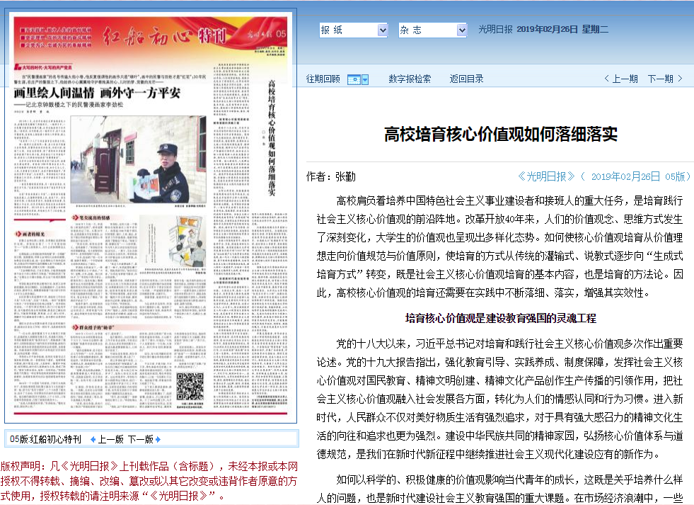2019年2月26日,《光明日报》红船初心特刊发表十三水在线 张勤教授的理论文章《高校培育核心价值观如何落细落实》。