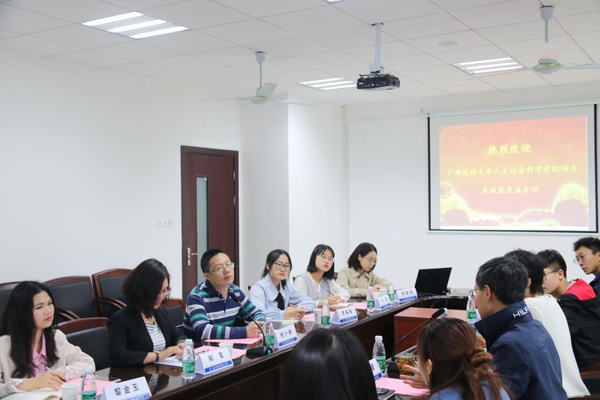 会议伊始,施向峰副院长对郑茸一行的到来表示热烈欢迎,他从专业设置、机构设置、师资队伍建设、招生与就业、办学条件、办公条件等方面整体介绍了十三水在线 人文十三水在线 情况,重点突出了其学科特点、科研优势以及研究生教育的支持体系和支撑条件,施院长表示十分欢迎广西医科大学同学们报考十三水在线 研究生。团委书记卢一亭在交流中就对方关于共青团发展等相关问题进行了耐心细致的解答,就如何深入开展思想引领工作、如何调动学生参与创新创业的积极性等内容,双方充分交流,互为启发,在认真愉快的氛围中结束了交流调研活动。随后大学生法律援助中心、国学社、研究生会等学生代表也与广西医科大学学生代表就学生活动、组织策划等进行探讨。