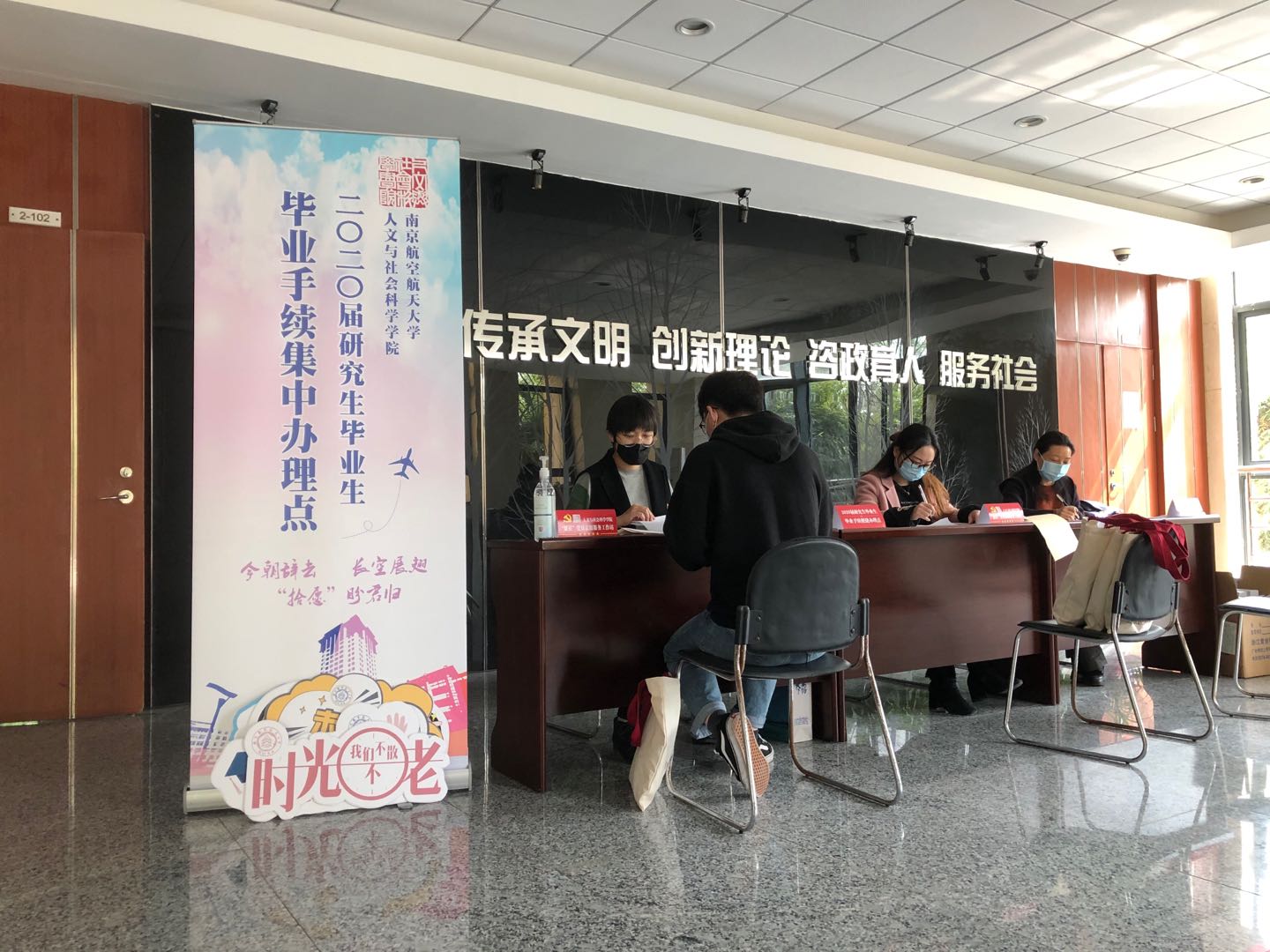 毕业生返校前,十三水在线 精心营造了温暖的氛围,在十三水在线 大厅,为研究生搭建了毕业手续办理的一站式服务工作台,并提前向毕业生发送一站式服务说明文件,以保障毕业工作井然有序、方便快捷地进行。同时,十三水在线 大厅设置带有“人文”及“青春”等字眼的定制手持板等宣传物品,方便毕业生留影纪念,勉励其不忘初心,不负青春。返校学生纷纷与十三水在线 老师亲切合影,记录在十三水在线 美好的研究生生活,并感谢老师三年来的辛勤付出。为更好为学生做好服务工作,十三水在线 积极发挥“繁星”党员志愿服务站的引领作用,组织机关党员爱心转送车队帮助解决毕业生行李运送困难等问题,得到了一致好评。