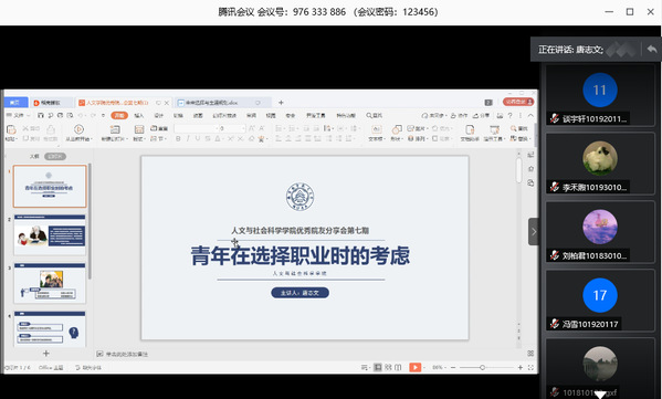 校团委办公室主任,他从事多年学生思想政治教育工作、学生培养工作,有着丰富的学生工作经验。本期分享会,唐老师以“青年在选择职业时的考虑”为主题,从“选择”的角度为同学们剖析青年在选择职业时应有的考量。