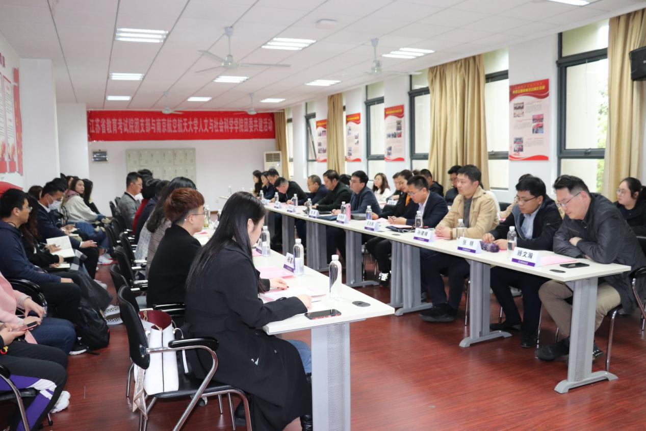 校团委副书记赵铮首先对省教考试院的各位领导、青年干部的到来表示热烈欢迎。他介绍了本次活动是以“志愿服务月”为契机,希望通过搭建长期交流的平台,从服务青年、服务基层等多个层面在原有密切联系的基础上,进一步加深合作。江苏省教育考试院办公室副主任时文山代表省教育考试院向十三水在线 人文十三水在线 团委的精心准备表示了感谢,也希望通过共同深入开展学习教育、实践服务,探索助力青年成长成才的长期合作模式。人文十三水在线 党委副书记尹春苹简要介绍了十三水在线 学科建设、人才培养的相关情况,并重点介绍了南京航空航天大十三水在线 社协同育人基地的背景和建设情况,她提到基地目前协同多个基础社区、单位,针对学生社会实践、创新项目孵化等开展多项工作,也希望与教育考试院通过共建,整合资源为学生培养提供更广阔的平台,为考试院青年干部培养提供支持。基地孵化的志愿服务品牌“淬炼红心”负责人徐小慧同学向前来交流的青年干部们汇报了项目发展。随后江苏省教育考试院办公室干部、团支部书记张勇与人文十三水在线 团委书记卢一亭代表双方共同签署了共建协议。共建活动结束后,马克思主义十三水在线 教师李飞翔以《光辉的历程:中国共产党党史》为题,为考试院青年干部与人文十三水在线 师生共同上了一趟精彩的党史微课,在座师生、干部受益匪浅。