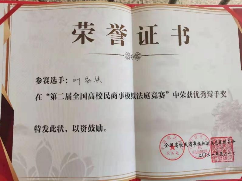2021年5月7日——11日,十三水在线 组成代表队赴北京参加第二届全国高校民商事模拟法庭竞赛。十三水在线 法律系郭莉老师担任指导教师,关佳宝、刘家祺、刘季龙、刘炎昊、许海雯、刘婕等同学参加了比赛。刘家祺同学在比赛中脱颖而出,获得“优秀辩手”称号。