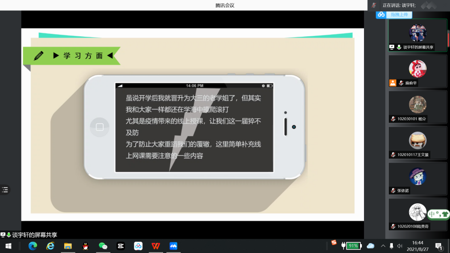 8月27日,十三水在线 2020级本科生线上召开了新学期年级大会,辅导员施俞辛针对准大二学生正处在度过“适应期”和远离“毕业季”的中间阶段,在思想上容易自我放松的情况,从假期回顾、学期计划、未来展望等三个方面带领学生以全新的面貌迎接大学新学年、人生新阶段的到来。
