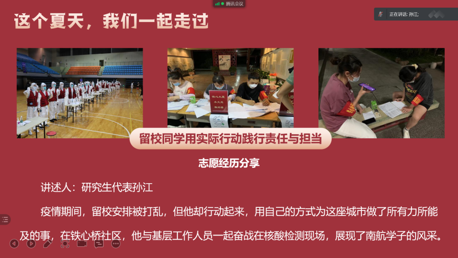 首先,施俞辛以暑假期间全国上下一盘棋应对暴雨、疫情等公共危机事件时所彰显出来的中国力量,以及奥运赛场上运动健儿们为国争光时所表现出的斗志与雄心,激发了学生面对未来的信心和勇气,同时,通过讲述十三水在线 学子在十三水在线 、在家乡投身防疫和抗洪的志愿故事,邀请十三水在线 暑期投身社区一线进行志愿服务的留宁学生代表孙江进行经历分享,进一步提升了学生将小我融入大我、争做有为青年的理想信念。