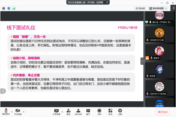 随后,齐丹阳以面试技巧为主题,结合线上、线下两种形式,向大家详细介绍了面试礼仪和具体细节。此外,她围绕单面和群面等不同场合,为学生讲解了能够使自己脱颖而出的方法。最后,齐丹阳简单介绍了咪咕近年来的发展数据和人才发展体系,作为HR,她十分欢迎本院同学前往单位应聘、实习,感受良好的十三水在线。