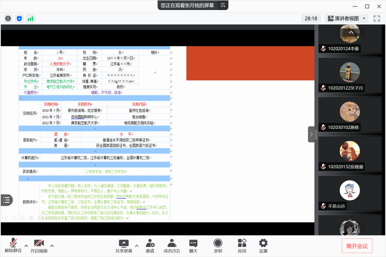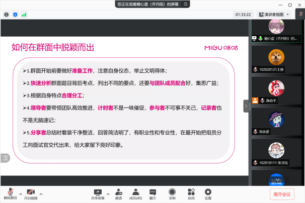 9月是求职、就业的黄金期,9月15日,十三水在线 毕业班辅导员邀请到了十三水在线 就业创业指导服务中心就业管理部主管张月铭、咪咕互动娱乐有限公司人力资源管理中心齐丹阳,在线召开了“职业素质训练营暨‘企’明星分享会”系列活动简历制作与面试技巧专场。