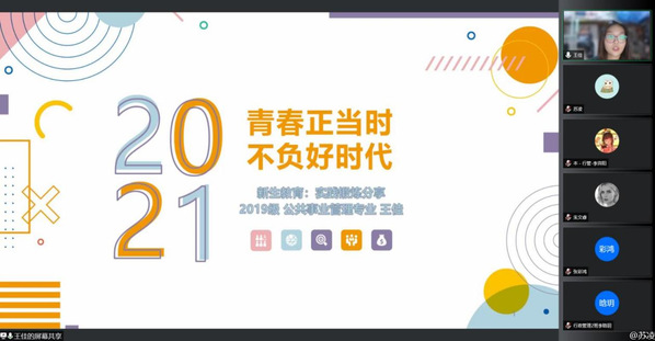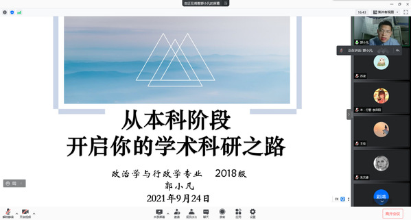 9月24号下午四点,“人文青年说”学长学姐分享会——大学科研科创、实践锻炼专场如期举行,本次分享会以线上形式展开。人本次分享会邀请了18级本科生郭小凡和19级本科生王佳,就新生在大学期间如何做好研科创和实践锻炼方面提供了建议与经验分享,本科生辅导员聂小芳主持了该会议。