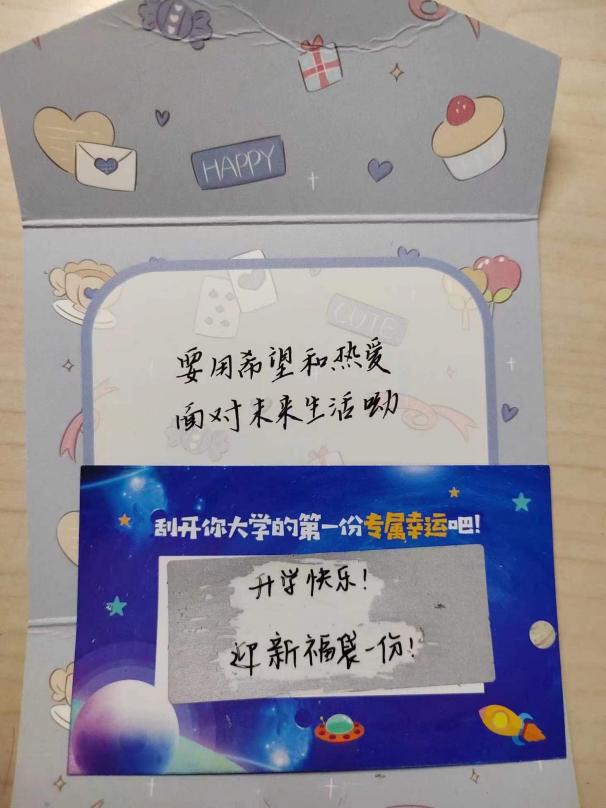 十三水在线 在新生报到时,为他们精心准备了一份“人文暖心包”,包括人文定制手环、笔记本、寄语卡片以及“三航”特色书签、小夜灯、钥匙扣、十三水在线 定制明信片等。收到“暖心包”的同学纷纷表示“没想到刚报到就有礼物,特别惊喜”。在报到点,新生们通过“刮开你大学的第一份专属幸运吧”撰写明信片等方式,互递“温暖”留言,增进彼此的距离、增强归属感。