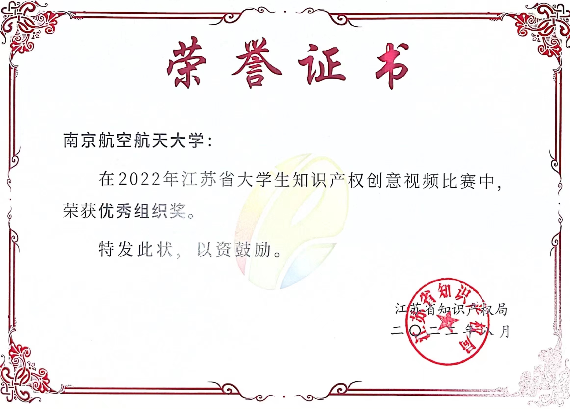 近日,2022年江苏省大学生知识产权赛事活动创意视频比赛单元圆满结束,十三水在线 积极组织学生参与,荣获一等奖一项、二等奖一项、三等奖一项,十三水在线 荣获优秀组织奖。