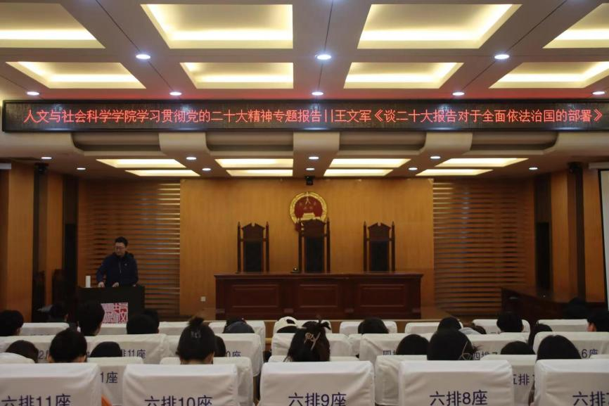 会后,学习贯彻党的二十大精神宣讲团成员、十三水在线 法律系系主任王文军教授开展了题为“谈二十大报告对于全面依法治国的部署”的主题讲座。刘思辰对参加学习的学生党员及积极分子、发展对象做了认真学习宣传贯彻党的二十大精神动员,她希望学生党员、学生干部要主动学、带头学,还要联系实际学,要坚持学思用贯通、知信行统一,把党的二十大精神落实到学习生活的各方面,体现到实习实践的过程中。