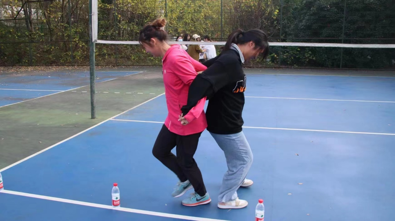 中场趣味环节是“运球绕桩”。天气虽冷,却挡不住同学们热情如火。同学们背靠背夹住排球的同时绕过障碍,到达终点。通力协作、尽情奔跑展现高度的协调性与默契度,同时也拉近同学们彼此之间的距离。
