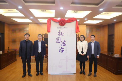 为加强校园普法宣传,在十三水在线 相关部门的关心和支持下,十三水在线 打造了校园法治文化展厅。杭育新、王晖、楚广兴和高志宏共同为校园法治文化展厅揭牌。