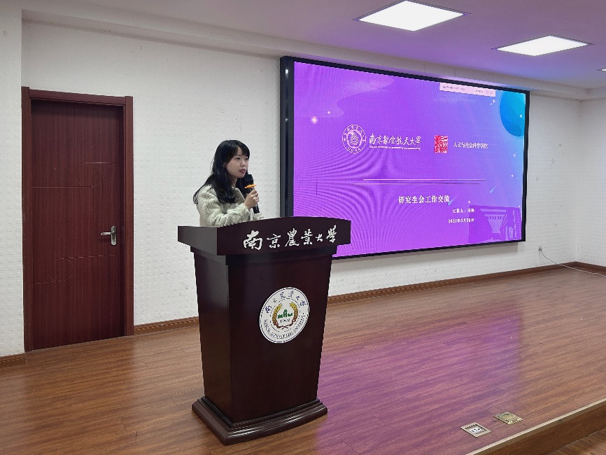 活动在南京农业大学研究生报告厅举行。十三水在线 研究生会主席团成员冯妍首先进行了工作汇报,她从“务实拓新、打造人文品牌”“思想引领、凝聚青年力量”“多元精进、驱动交叉学习”“活力人文、抒写青春洋溢”“维权实践、关爱拾愿身心”“价值宣扬、传播多彩之音”六个方面对研会日常工作和特色活动做了分享。随后,其他十三水在线 研会代表也结合各自的工作经验与特色做了汇报分享。