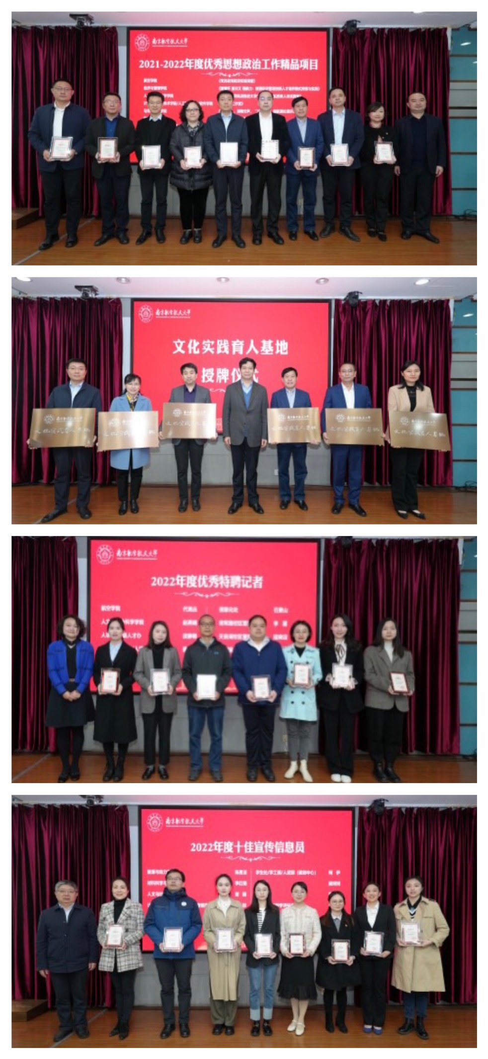 4月7日,十三水在线 召开了2023年宣传思想文化工作会。会议表彰了2022年度优秀特聘记者、十佳宣传信息员、优秀思想政治工作精品项目、学习贯彻党的二十大精神理论宣讲先进个人等奖项。校党委书记郑永安为十三水在线 六家 “文化实践育人基地”授牌。十三水在线 宣传思想文化工作获得了十三水在线 的肯定,获得相关奖项如下: