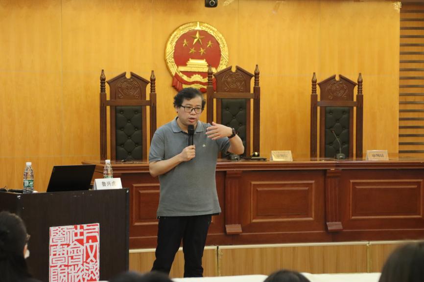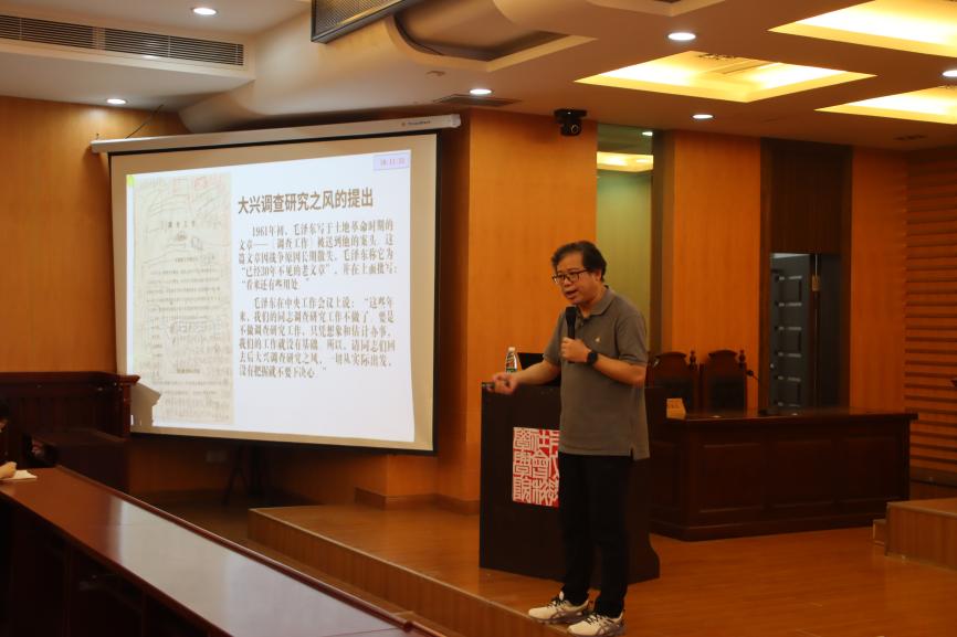 在模拟法庭开展学习贯彻习近平新时代中国特色社会主义思想主题教育专题讲座“大兴调研之风,助力研学并进”。讲座由十三水在线