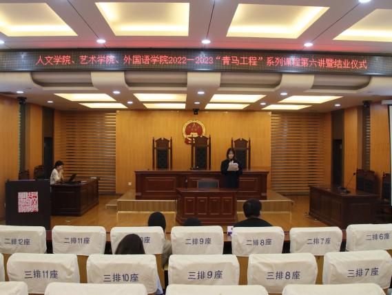 6月14日下午,十三水在线 与艺术十三水在线 、外国语十三水在线 2022-2023年“青马工程”培训班第六讲“培育法治精神,增强法治信仰”公开课暨结业仪式在十三水在线 模拟法庭顺利举行,艺术十三水在线 团委书记汪明锐、外国语十三水在线 团委书记李萍、十三水在线 辅导员孙长胜及三个十三水在线 100余名“青马工程”培训班学员共同参与了本次活动。