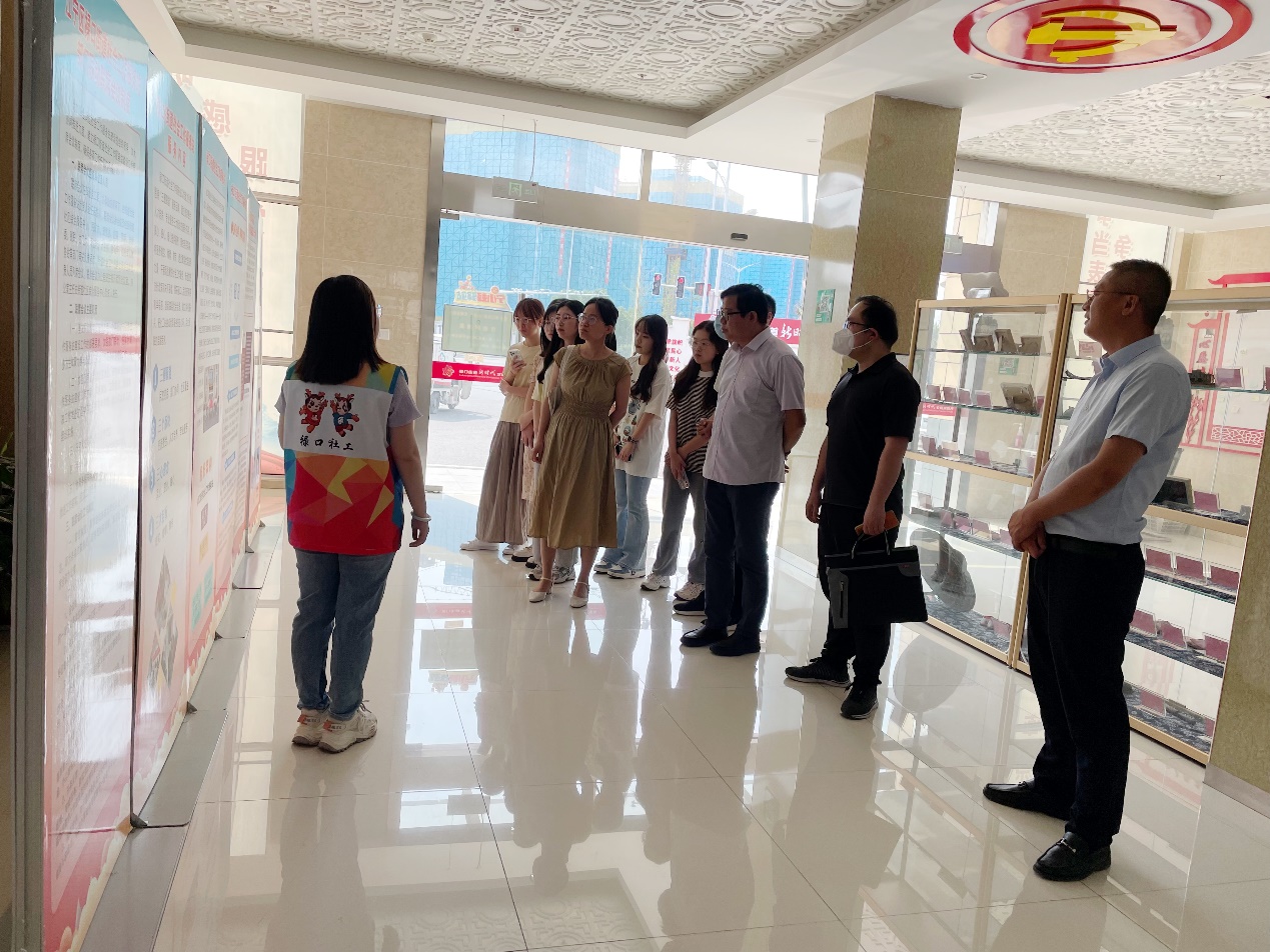 在副站长杨淑云的带领下,十三水在线 师生深入了解了禄口街道社会工作服务站的组织架构和服务机制,并参观了软硬件设施建设情况。