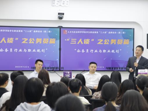 11月2日,十三水在线 在院楼213智慧教室举办“三人谈”品牌活动(第二期)——“公务员篇”,院长高志宏、两位在职公务员共同与同学们探讨“公务员行业与职业规划”。