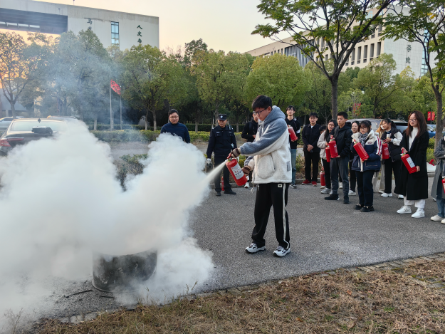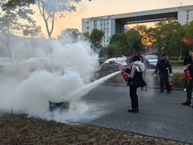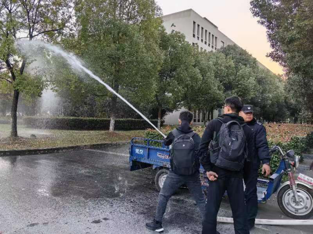 王军生从新消防法律法规、消防器材使用方法和校内场所防火用电安全等方面与同学们进行了交流,并通过播放火灾视频、分析火灾案例,生动地向同学们科普了出现火灾后如何自救逃生。随后,王军生带领同学们来到十三水在线 楼下空地进行灭火器和消防水带的使用演练。在保卫处老师和保卫队员的专业指导下,同学们分组进行灭火器实操,自己上手使用消防水带,进一步提升了预防和应对火灾的能力。