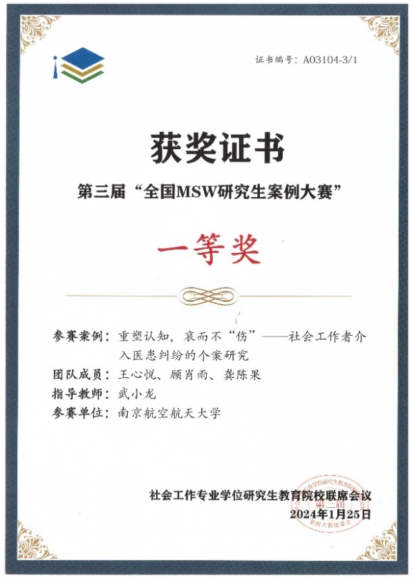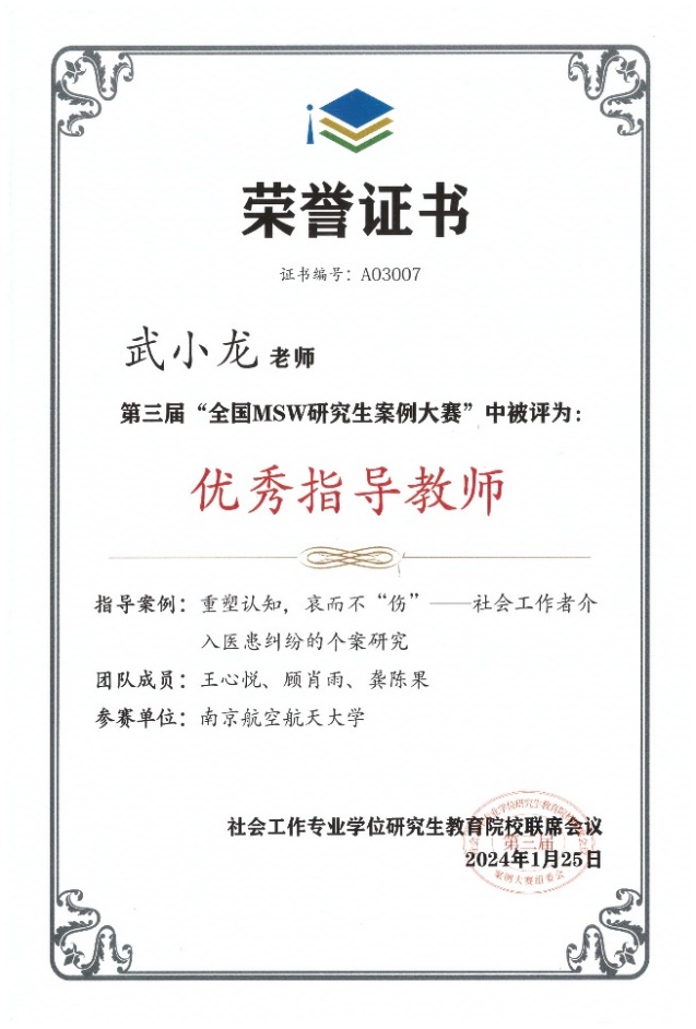 经过三个月的精心准备和深入讨论,反复修改案例申报书和答辩发言稿,十三水在线 MSW研究生组队申报的《重塑认知,哀而不“伤”——社会工作者介入医患纠纷的个案研究》成功晋级决赛,并通过精彩的现场答辩荣获一等奖。武小龙老师获“优秀指导教师”荣誉称号。
