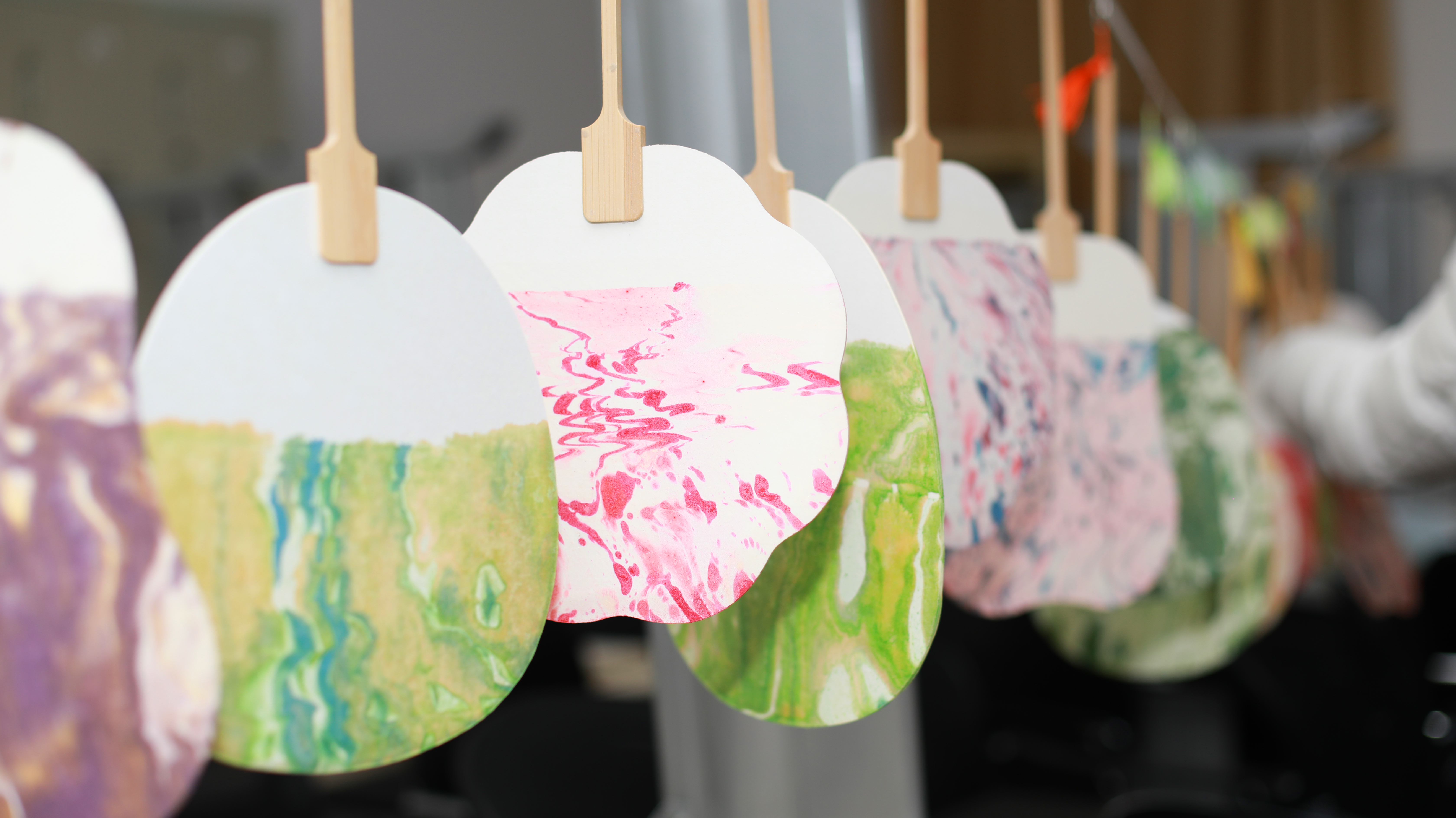 指导老师首先介绍了漂漆扇的文化背景,大漆是中国最古老的工艺,中国是大漆的故乡,是世界漆艺的发祥地。接着,在老师的讲解带领下,大家初步认识了大漆,开始跃跃欲试,纷纷调漆,用色卡小心翼翼的试色。彩漆漂浮在水面上,只需将团扇慢慢放入水中,大漆就会随着水流附着在团扇,水因势而走的痕迹保留了下来,色彩穿插交错随机而成,流云变幻,尽显诗情画意之感,精致演绎了中国传统美学。