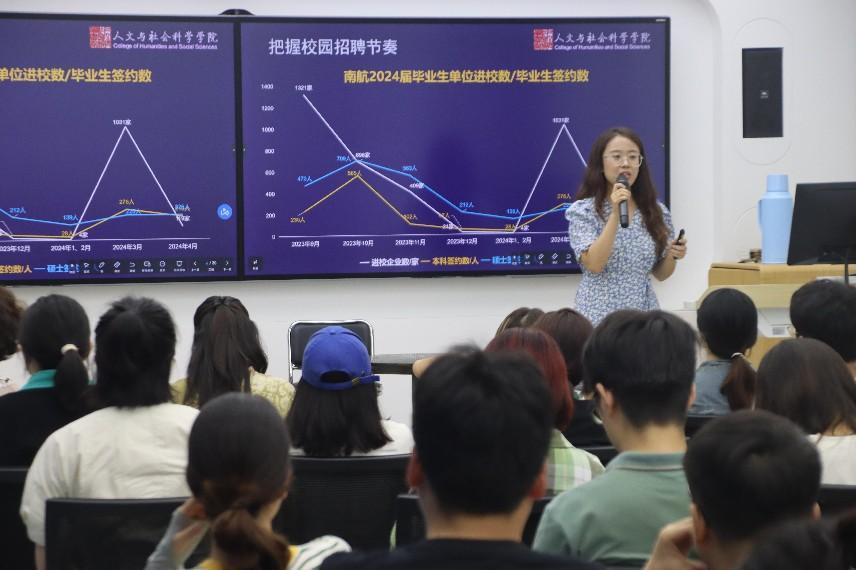 施俞辛结合上一年度毕业生的就业去向,分析了同学们可参考的就业去向选择,她结合本届毕业生前期就业摸底情况,向同学们分析了当前就业形势的变化趋势,并提醒同学们要根据自己规划结合自身需求去选择就业方向,不要盲目的随波逐流。同时,她通过用人单位的视角,鼓励同学们在就业过程中要保持对自身院校专业、对自我能力的充分自信,敢于去尝试多样化的就业方向。