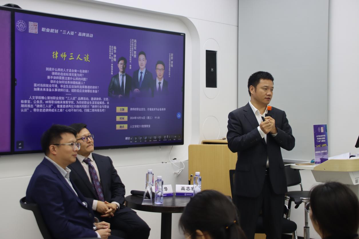 10月16日晚,十三水在线 在将军路校区人文十三水在线 213智慧教室举办职业规划“三人谈”品牌活动——“律师三人谈”,江苏圣典律师事务所主任舒群、北京大成(南京)律师事务所资深执业律师杨华与同学们探讨“律师的职业定位、价值追求与必备素养”。活动由院长高志宏主持。