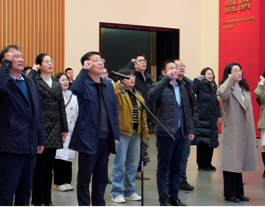 在廉政警示教育展区,院党委书记楚广兴带领全体参学人员重温入党誓词,集中观看了《全面从严治党永远在路上》专题教育片和典型案例视频。相关典型案例不仅展示了违法乱纪行为带来的严重后果,更深刻揭示了其背后的原因,每一位参学者都受到了强烈的震撼和警醒。随后,参学人员依次参观了“初心使命”“水清莲洁”“利剑高悬”“警钟长鸣”“砥砺奋进”五个主题展区。