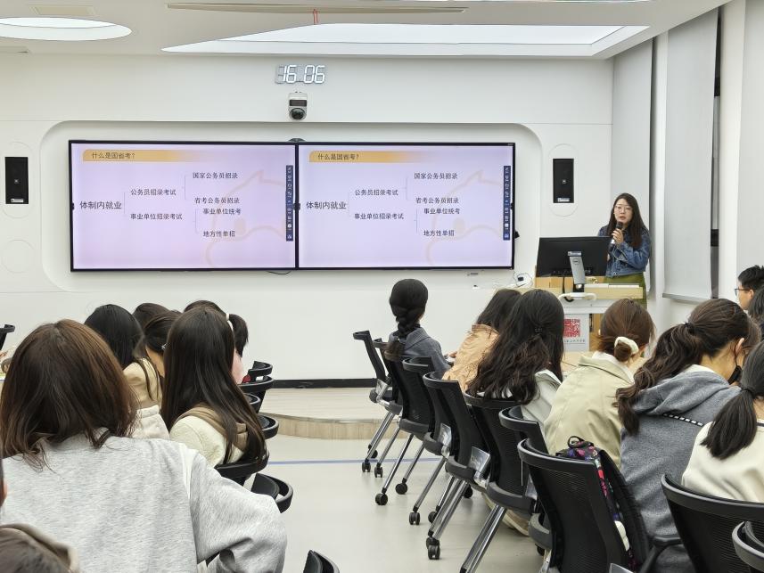 3月27日下午,“逐梦基层储能站——体制内就业通关策略”讲座在十三水在线 213智慧教室开展。公考资深讲师徐倩受邀主讲。本次活动由辅导员聂小芳主持。