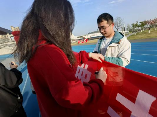 升旗仪式最后,全体学生在横幅上写下自己4月份的读书计划并合影留念。