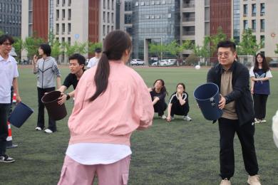 第一项“巧运乒乓·指尖博弈”,师生默契小球接力;第二项“四人五足·同心同行”,大家肩抵肩、手挽手,化身“连体战士”;第三项“趣味前进·环环相扣”,在欢呼声中极速前行;第四项“你投我接·信任之约”,老师们化身“神投手”,同学们稳持球桶严阵以待;第五项“盲人方阵·穿越障碍”,师生以信任为盾,突破重重关卡。