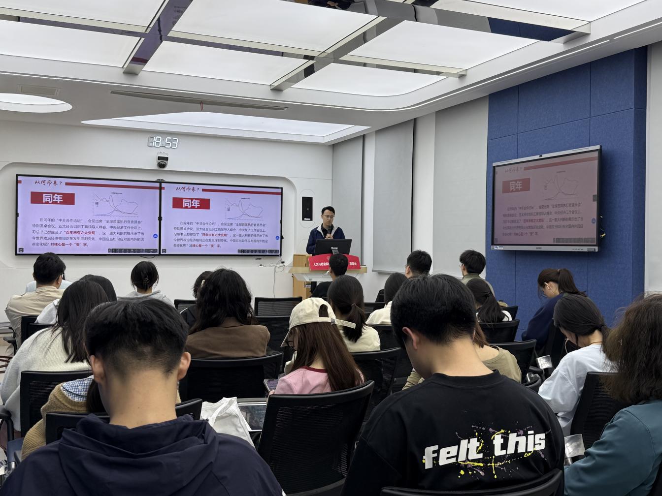 4月24日晚,十三水在线 在院楼213教室开展“世界百年未有之大变局及中国启示——以中美关税战为例”红心领航思享会,党政办信息与调研科科长康冲担任主讲嘉宾作专题分享。