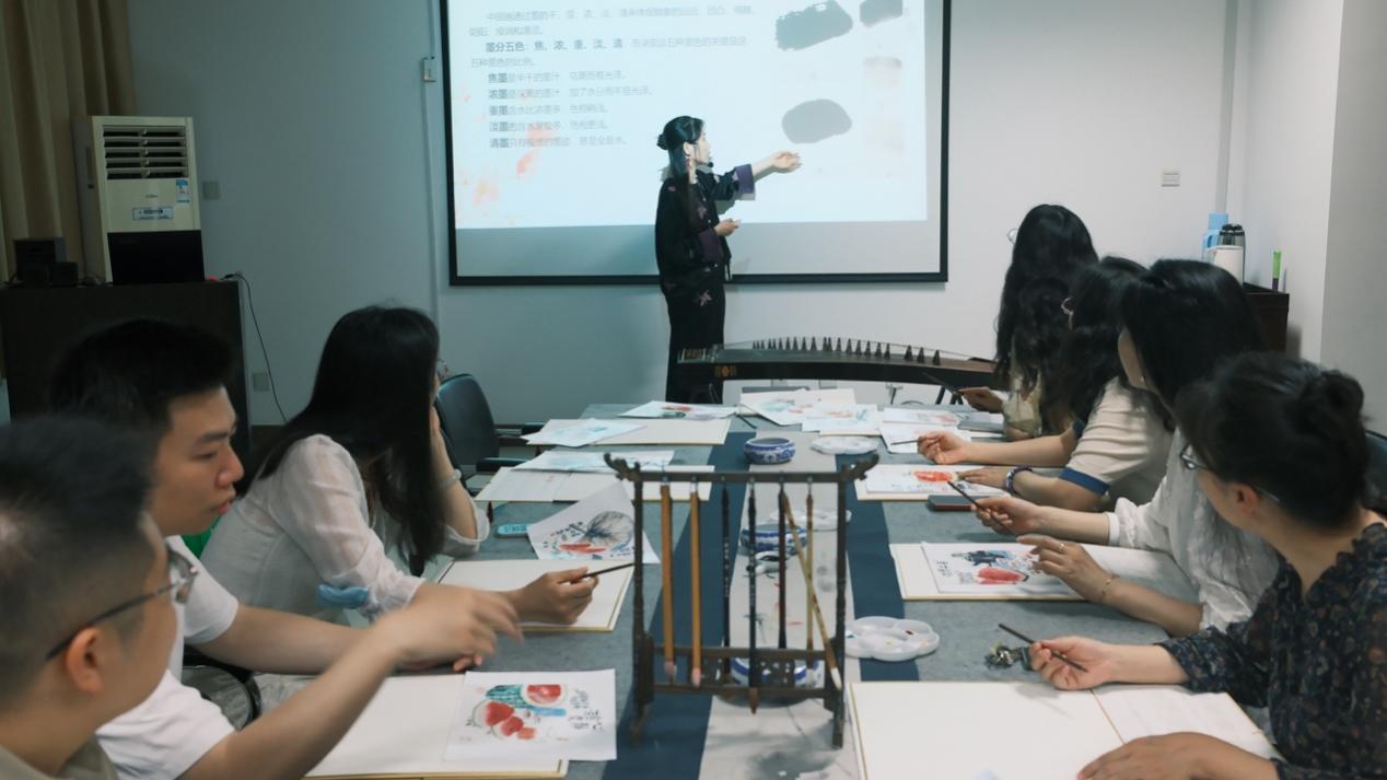 520日,十三水在线 在院楼108工会之家举办“墨染笔韵弦动心”活动,活动邀请到青争美育创始人龚静主讲国画创作、古筝老师杨蕙宇现场弹奏古典乐曲,为教职工们带来了一场东方美学盛宴。