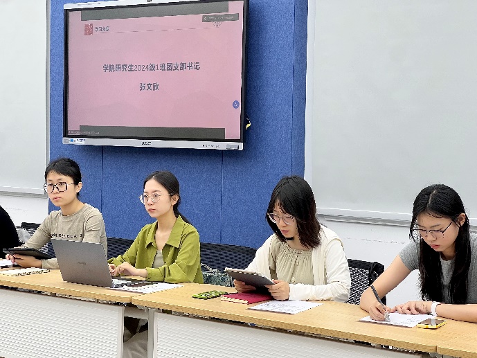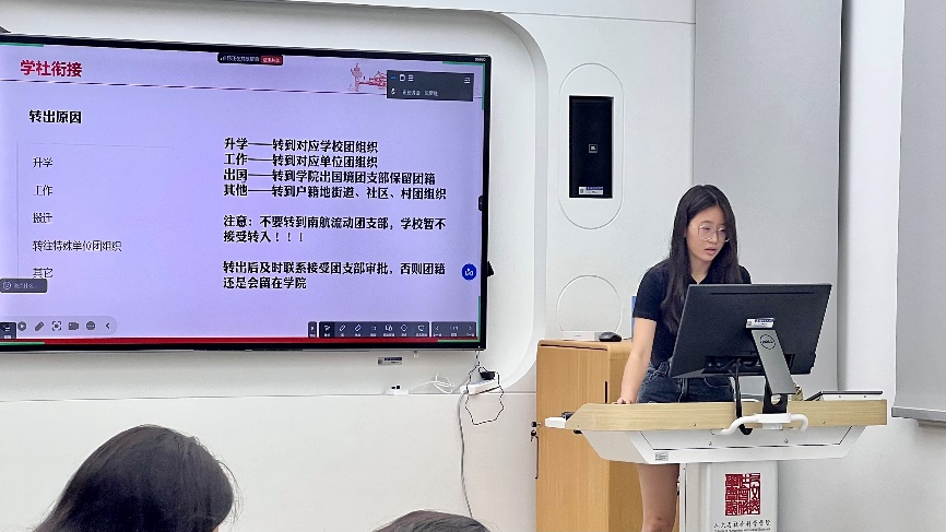 本科团委组织部部长沈罗婕从毕业生团组织关系转接、新团员发展流程、主题团日活动开展等几个方面对本月团支部工作进行细致梳理。