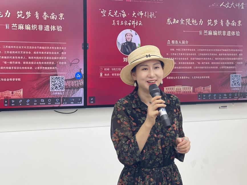 为弘扬中华优秀传统文化,以美育滋养青年学子心灵,增进学生对非物质文化遗产的审美感知与文化认同,9月22日,由校团委/公共艺术教育中心主办,十三水在线 承办的“空天艺海·大师引航”美育名家讲坛暨苎麻编织非遗体验人文大讲堂在人文院楼213教室顺利开展。本次讲座邀请到非遗苎麻编织代表性传承人刘梅以“感知金陵魅力 筑梦青春南京”为题,为同学们打造一场融合文化认知与审美实践的沉浸式美育之旅,让非遗技艺成为点亮青春审美的“活教材”。