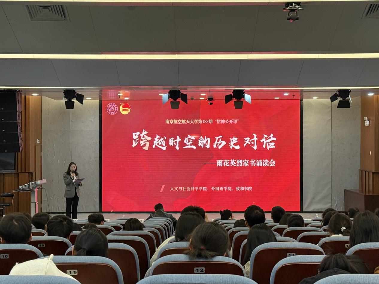 、致和书院联合承办的“跨越时空的历史对话——雨花英烈家书诵读会”信仰公开课,在天目湖校区巡天楼一楼报告厅举行。雨花台烈士陵园管理局党性教育处党支部书记、副处长孙静静,党性教育处教师杨柳担任主讲人,近二百名师生现场参与,共同开启一场与英烈跨越时空的精神对话。