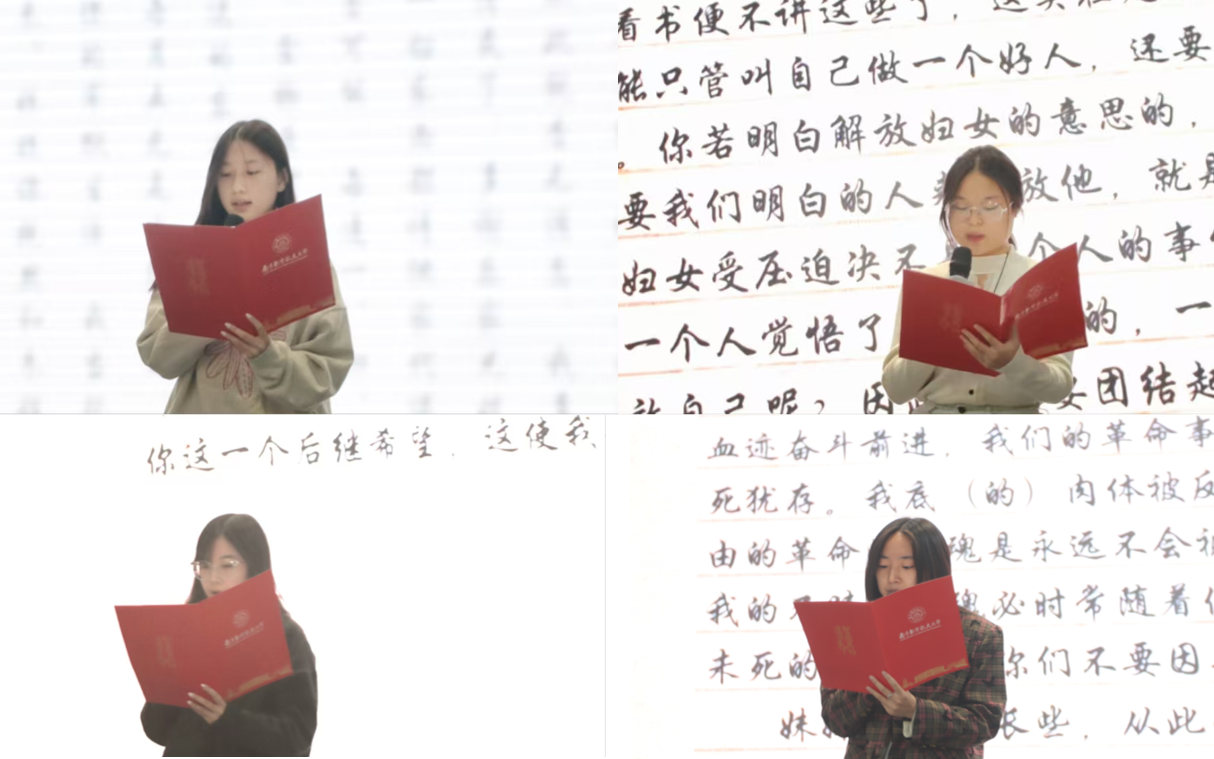 “我牺牲了我的一切,为的是我们民族的生存和解放……”“别了,我爱的人,我愿化作泥土,留在你必经的路上……”在学员诵读环节,学生代表们饱含深情地朗读雨花英烈家书原文。激昂的语调、真挚的情感,仿佛跨越时空的桥梁,将在场师生与革命先辈紧密相连。人文十三水在线 2024级学生王端端表示:“以前总觉得英烈的故事离我们很远,但今天通过家书,我仿佛能直接感受到他们的牵挂与信仰,这种精神力量让我深受震撼,也让我更加明白当代青年的责任与使命。”