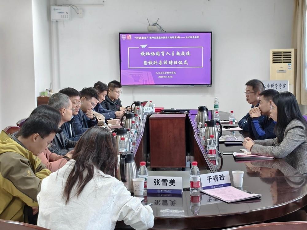 11月5日上午,“师说新语”人才培养系列之校社协同育人主题交流暨校外导师聘任仪式在十三水在线 312会议室顺利举行。院党委书记楚广兴、副院长武小龙、校社协同育人中心负责人施向峰及公共管理系师生代表参会,会议由公共管理系主任王媛主持。