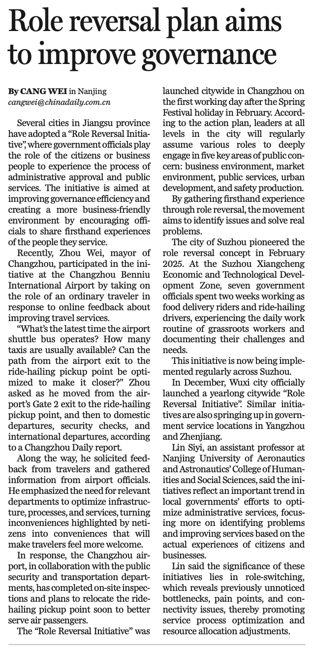 林思屹老师在采访中认为,“换位跑一次”是一种典型的体验式治理创新,有助于打破信息不对称,提升政策制定的精准性与回应性,是推动政务服务从“供给导向”向“需求导向”转型的重要路径,也有助于强化政府责任意识,提升公共服务的精细化与人本化水平。此类探索对于当前推进数字政府与服务型政府建设具有示范意义。